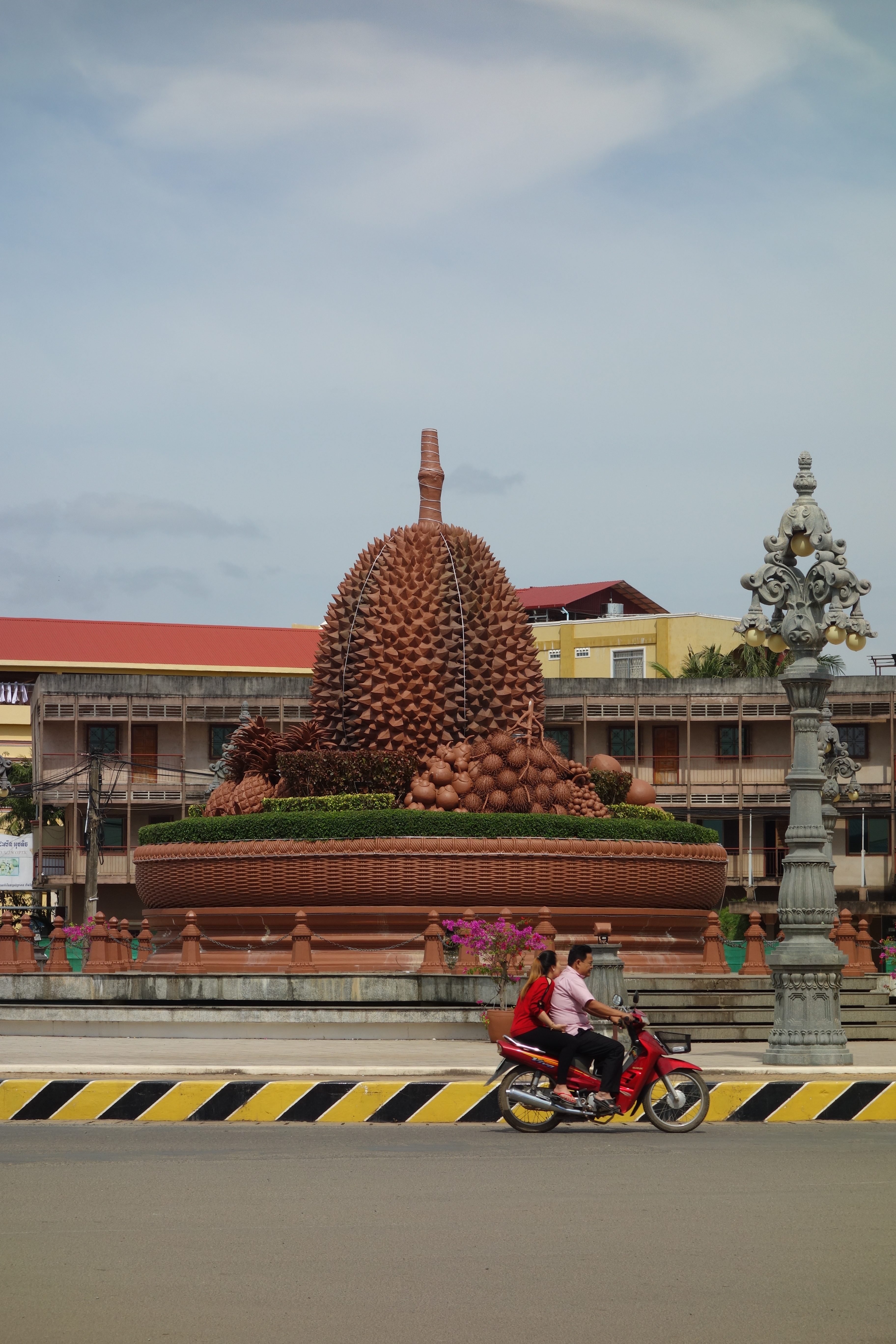 Previous Image Next Image dsc02553 There is an enormous tribute to the durian fruit in Kampot. Tastes like heaven, smells like hell, my Dad taught me. They actually explicitly ban the consumption of durian fruits on busses due to their stench.