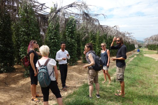 Previous Image Next Image dsc02606 We went to a pepper farm! That’s pepper plants, behind us. They are actually vines that grow on poles. Pepper is a super big deal in the Kampot area.