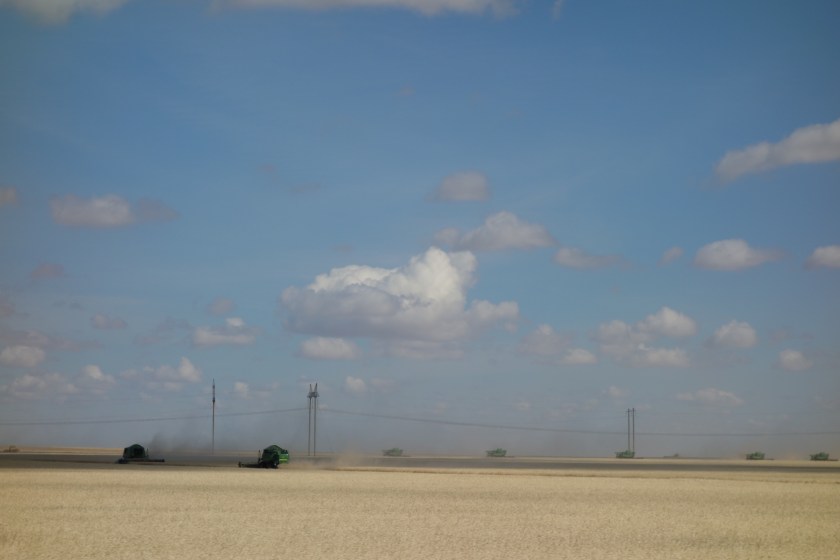 Previous Image Next Image dsc05552 Luke at this group (flock? school?) of headers. This is apparently how you harvest 10 gajillion acres of wheat at a time.
