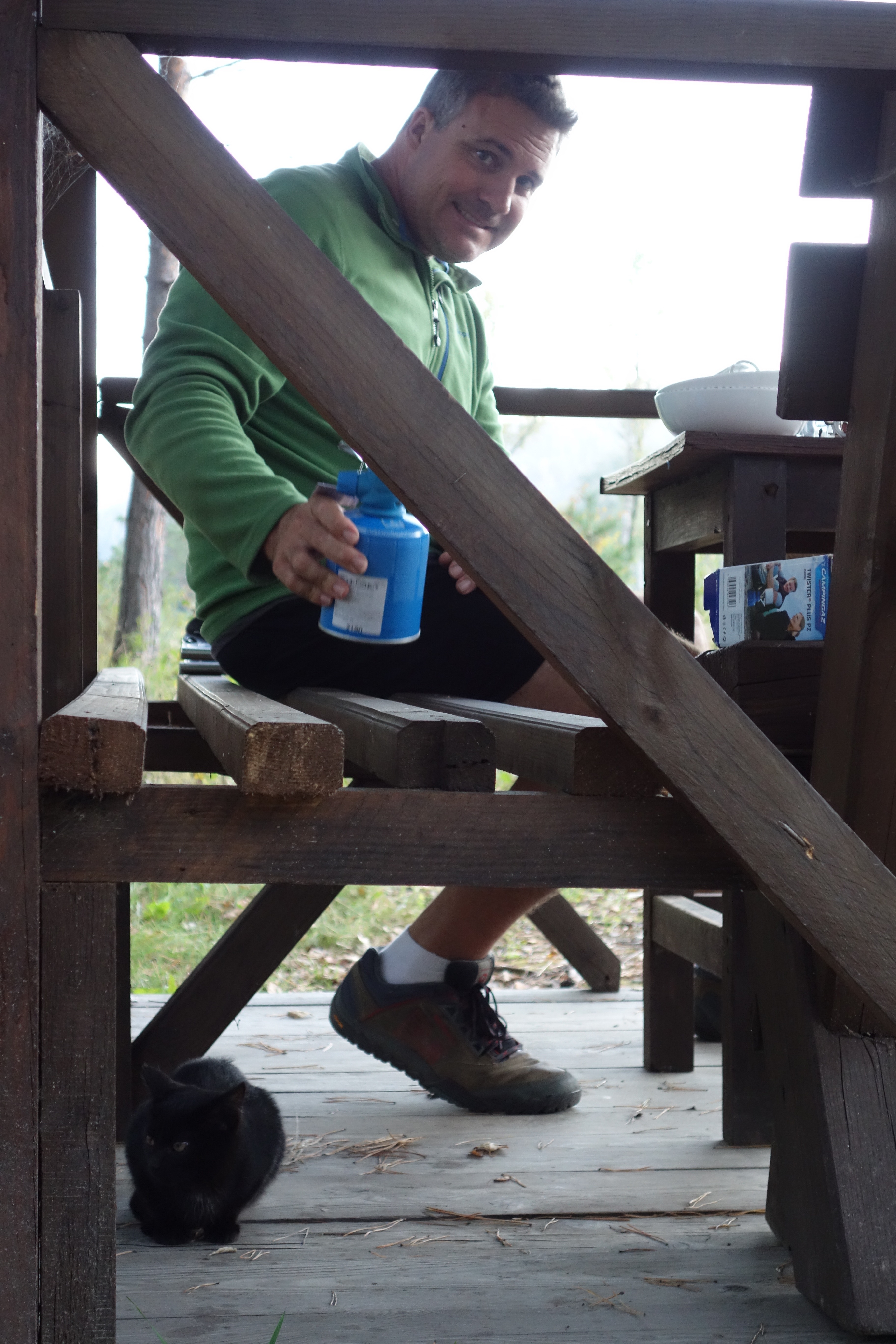 Luke cooks with a resident kitten.