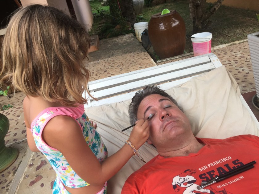 Previous Image Next Image img_0086 We stopped to see our French friends (from China) in Kep. Louison (artist, pictured on the left) had received makeup for Christmas and practiced her craft on Luke’s face.