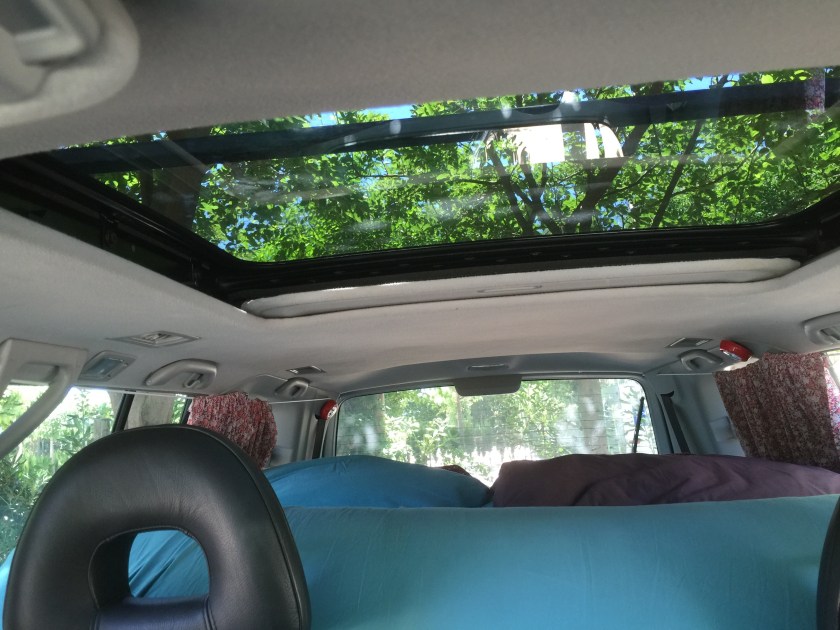 Previous Image Next Image IMG_5499 Another shot of the car, packed up to go. As you can see the mattress folds up at the end, so that we can push our chairs all the way back but still see out of the rearview mirror.